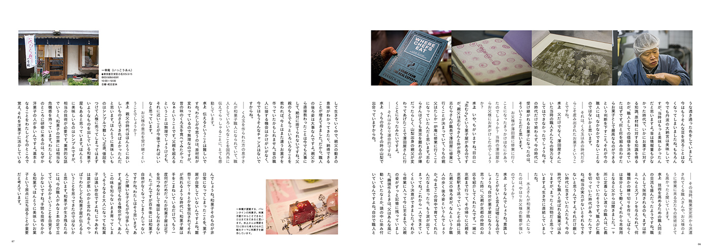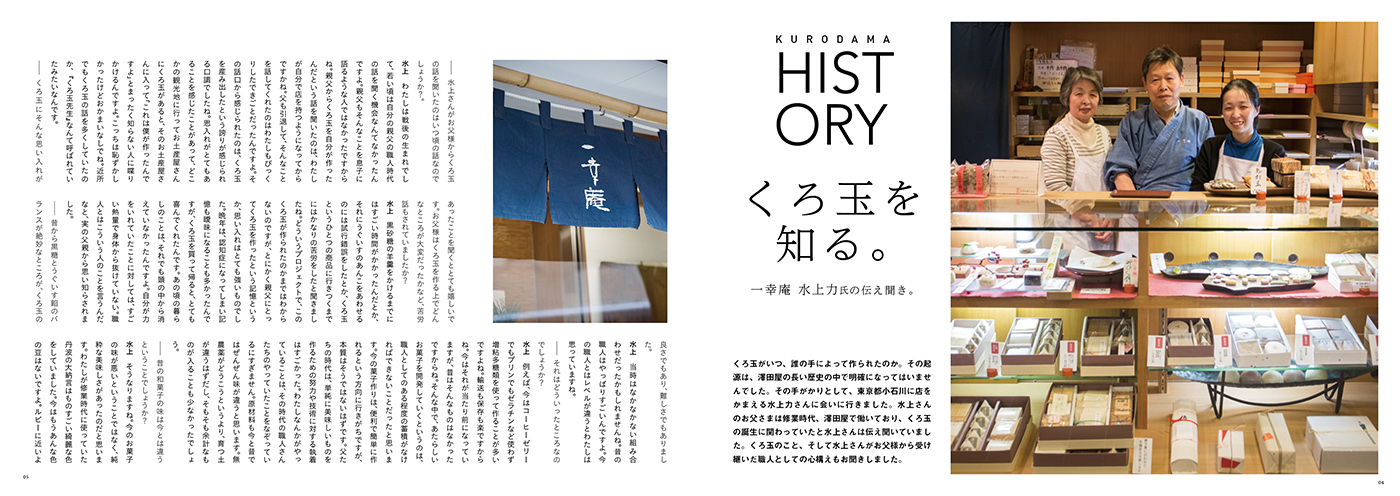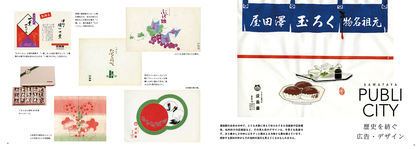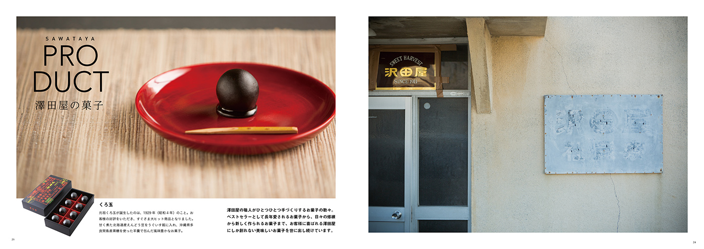 澤田屋 記念誌 OlderNewer 澤田屋 記念誌 創業100年をこえる澤田屋さんの新社長就任や新店舗の完成などを記念して、澤田屋の今までのあゆみをまとめた記念誌を編集させていただきました。くろ玉の制作秘話に迫るインタビューや、職人として切磋琢磨してきた澤田屋OBのみなさんの対談、和菓子や洋菓子をつくるその現場を1冊の本に納めました。和菓子の可能性をこの本でとても大きく感じました。 Categories ART DIRECTION, EDITORIAL DESIGN Share Client 澤田屋 Related Items mawari -小さな泊まれる廻舞台- EDITORIAL DESIGN 富嶽零景 EDITORIAL DESIGN ハタオリマチフェスティバル2021 ART DIRECTION, EVENT DESIGN, Graphic Design, Photograph