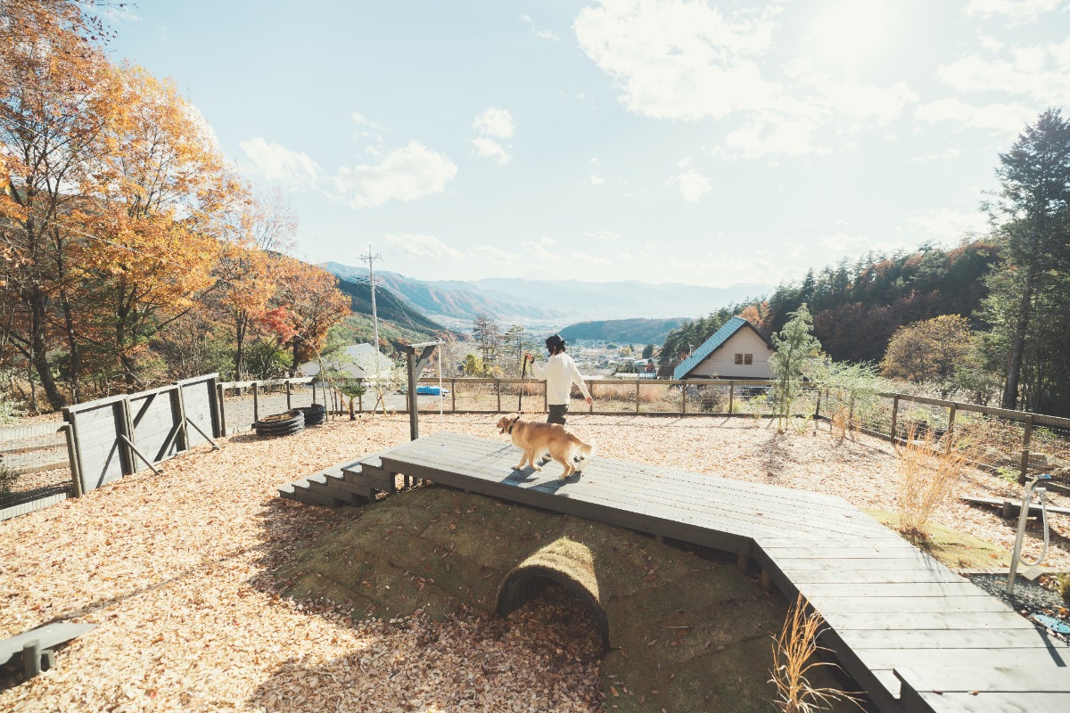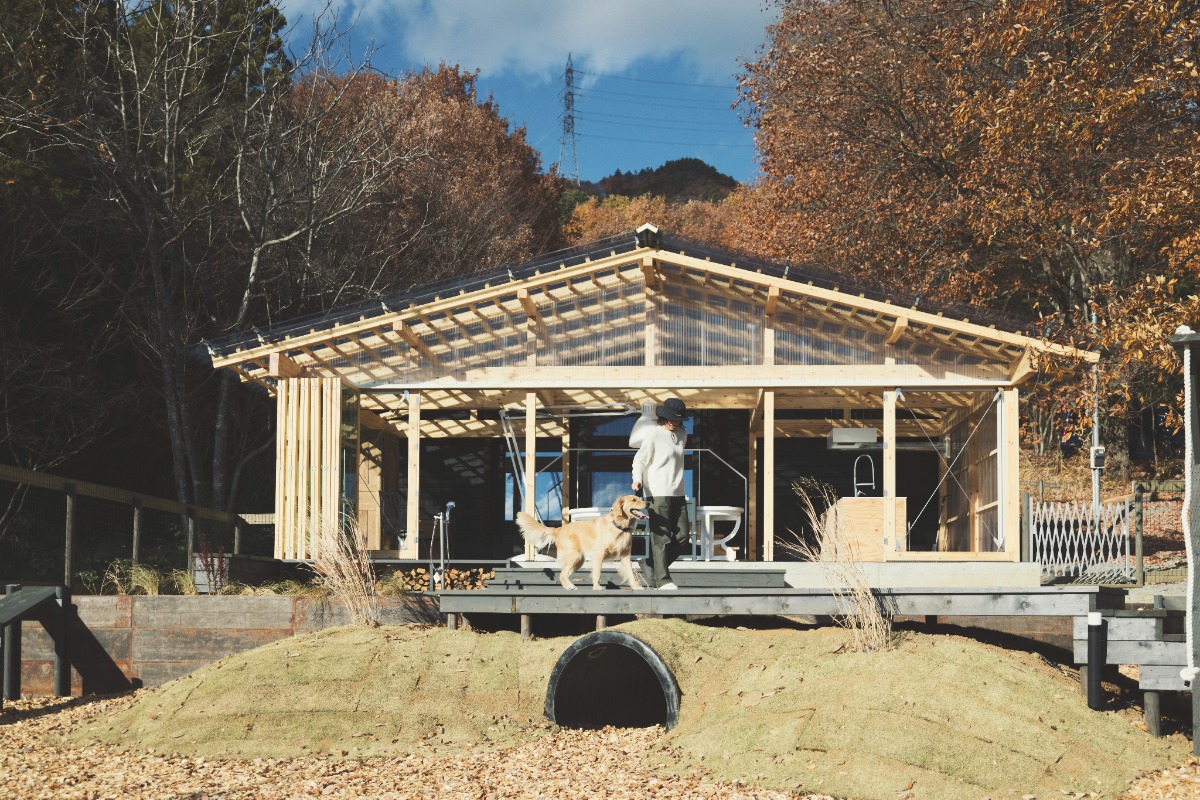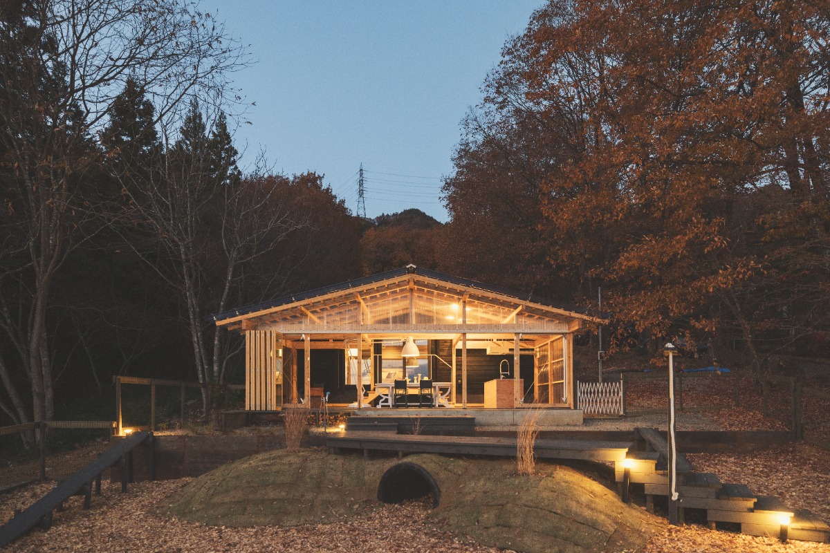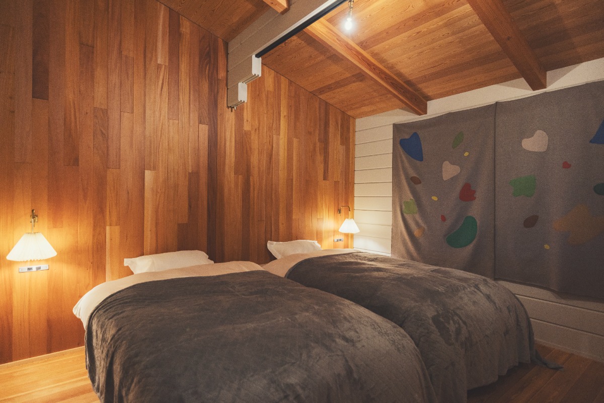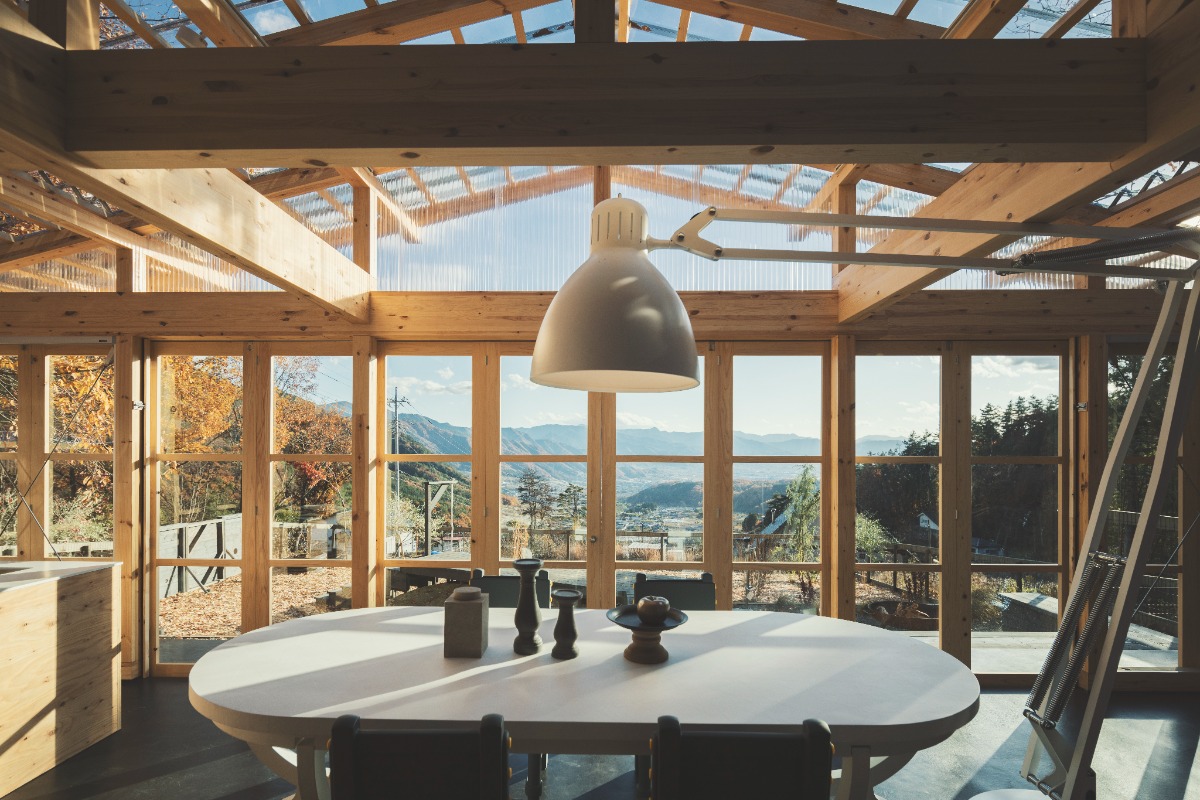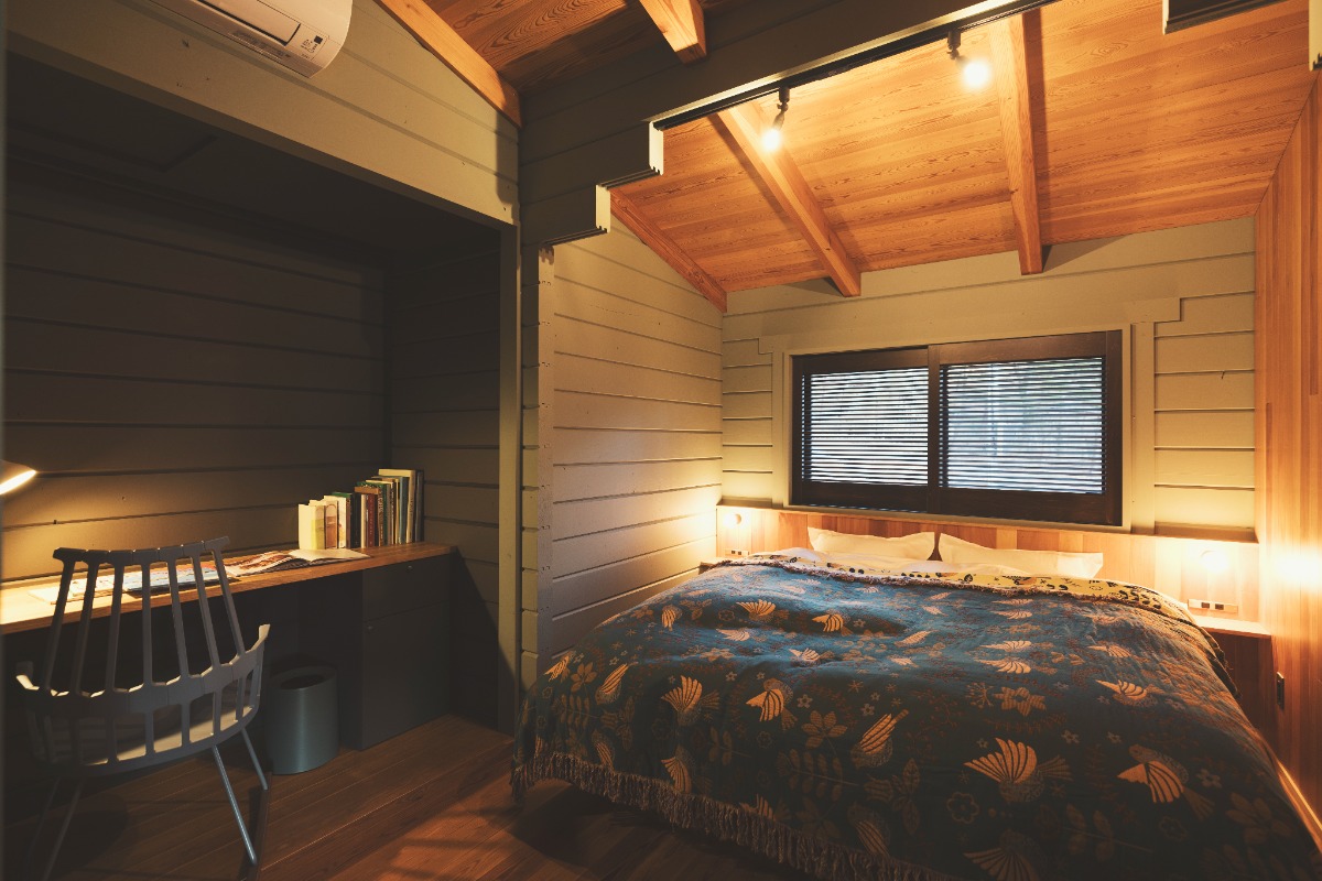 宿は開放的なテラスとキッチンダイニンスペースが印象的です。ベッドルームには富士吉田で織物を織るWatanabe Textileさん制作のカーテンも。